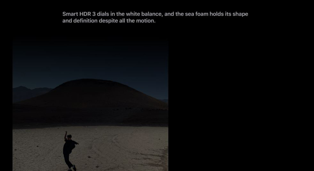 Smart HDR 3automatically refines highlights, shadows, and contours. Even at midday, you can see detail in her face and shadows that graduate all the way to true black. Smart HDR 3 captures every bit of golden hour magic, pulling out all the texture in the rock, while staying true to the subtle blues of the sky. It dials in the white balance, and the sea foam holds its shape and definition despite all the motion.