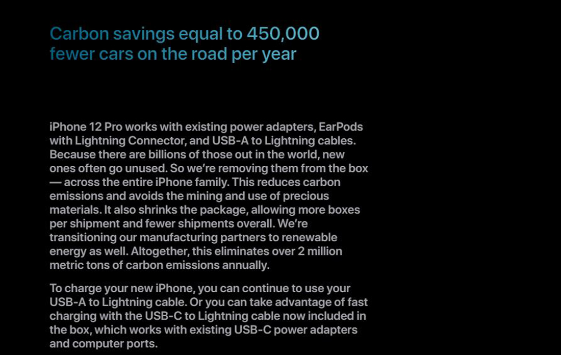 iPhone 12 Pro works with existing power adapters, EarPods with Lightning Connector, and USB‑A to Lightning cables. Because there are billions of those out in the world, new ones often go unused. So we’re removing them from the box — across the entire iPhone family. This reduces carbon emissions and avoids the mining and use of precious materials. It also shrinks the package, allowing more boxes per shipment and fewer shipments overall. We’re transitioning our manufacturing partners to renewable energy as well. Altogether, this eliminates over 2 million metric tons of carbon emissions annually. To charge your new iPhone, you can continue to use your USB‑A to Lightning cable. Or you can take advantage of fast charging with the USB‑C to Lightning cable now included in the box, which works with existing USB‑C power adapters and computer ports.