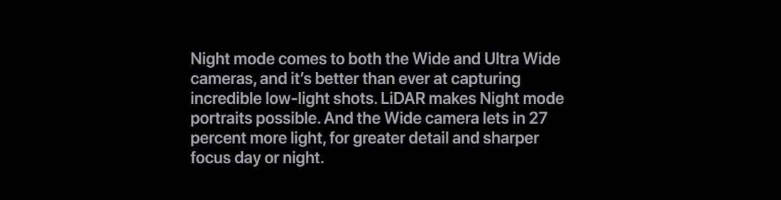 Night mode comes to both the Wide and Ultra Wide cameras, and it’s better than ever at capturing incredible low-light shots. LiDAR makes Night mode portraits possible. And the Wide camera lets in 27 percent more light, for greater detail and sharper focus day or night.