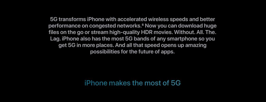 5G transforms iPhone with accelerated wireless speeds and better performance on congested networks.5 Now you can download huge files on the go or stream high-quality HDR movies. Without. All. The. Lag. iPhone also has the most 5G bands of any smartphone so you get 5G in more places. And all that speed opens up amazing possibilities for the future of apps.