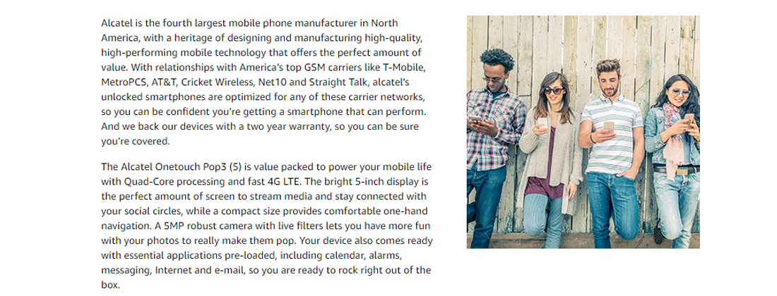 The POP 3?s Quad-Core processor supported by the long-lasting 2000mAh battery can easily take on the day with you to get things done without compromising battery life. Need to capture a picture? The Pop 3 comes with an 5 MP rear camera with auto flash.