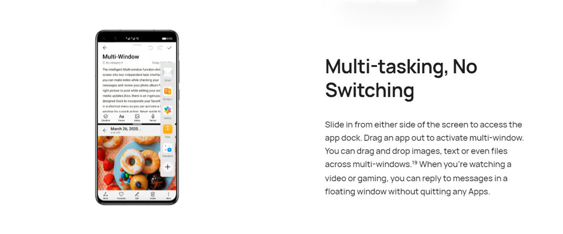 Slide in from either side of the screen to access the app dock. Drag an app out to activate multi-window. You can drag and drop images, text or even files across multi-windows.18 When you?re watching a video or gaming, you can reply to messages in a floating window without quitting any Apps.
