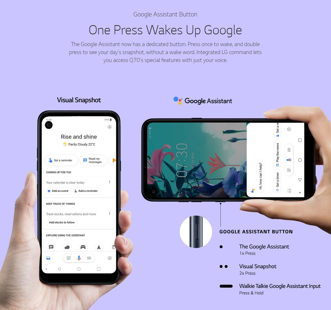 The Google Assistant now has a dedicated button. Press once to wake, and double press to see your day's snapshot, without a wake word. Integrated LG command lets you access Q70's special features with just your voice.