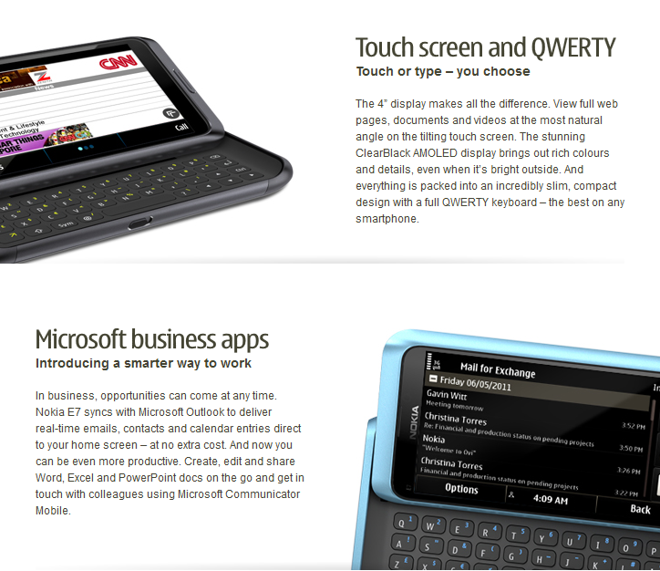 The Nokia E7 is for work and play, with QWERTY keyboard, touchscreen, office tools, and 8MP camera.